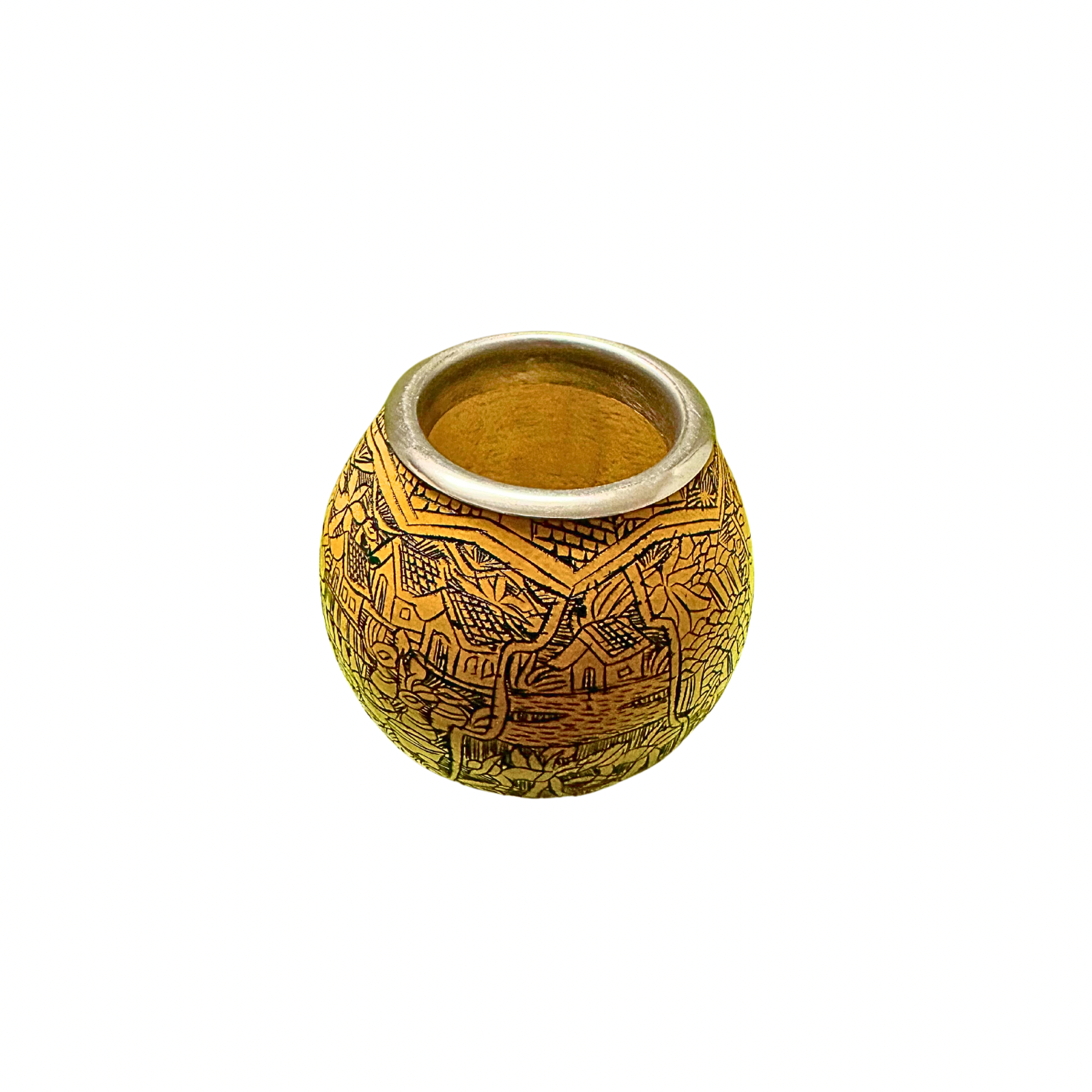 Calebasse classique élaboré par des artisans. La couleur naturelle ornée de magnifiques paysages équatoriens. Une véritable chef-œuvre façonnée par des artisans talentueux. Cette calebasse vous transporte dans un voyage visuel époustouflant à chaque instant.