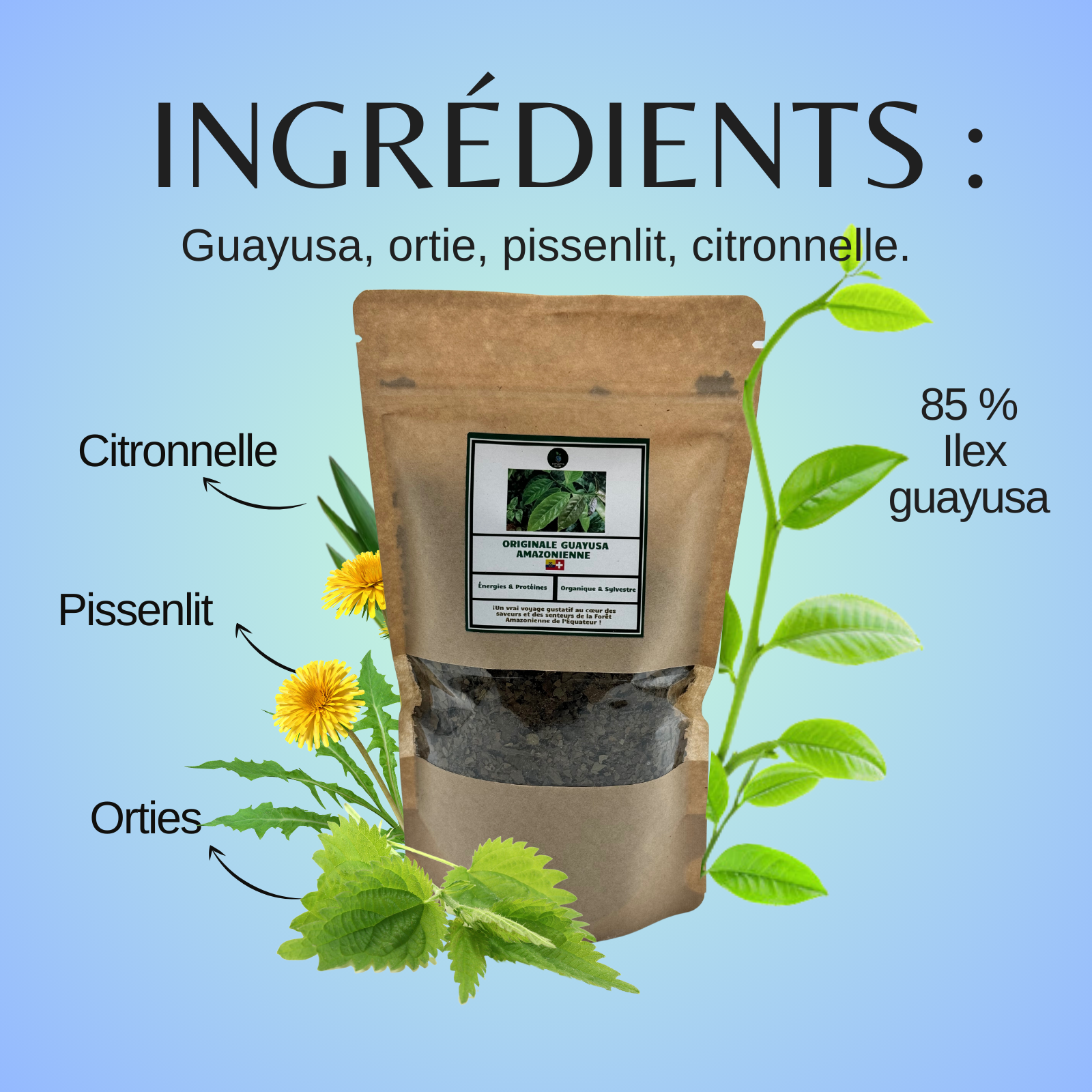 85 % d’Ilex Guayusa, ortie, pisenlit, citronnelle.