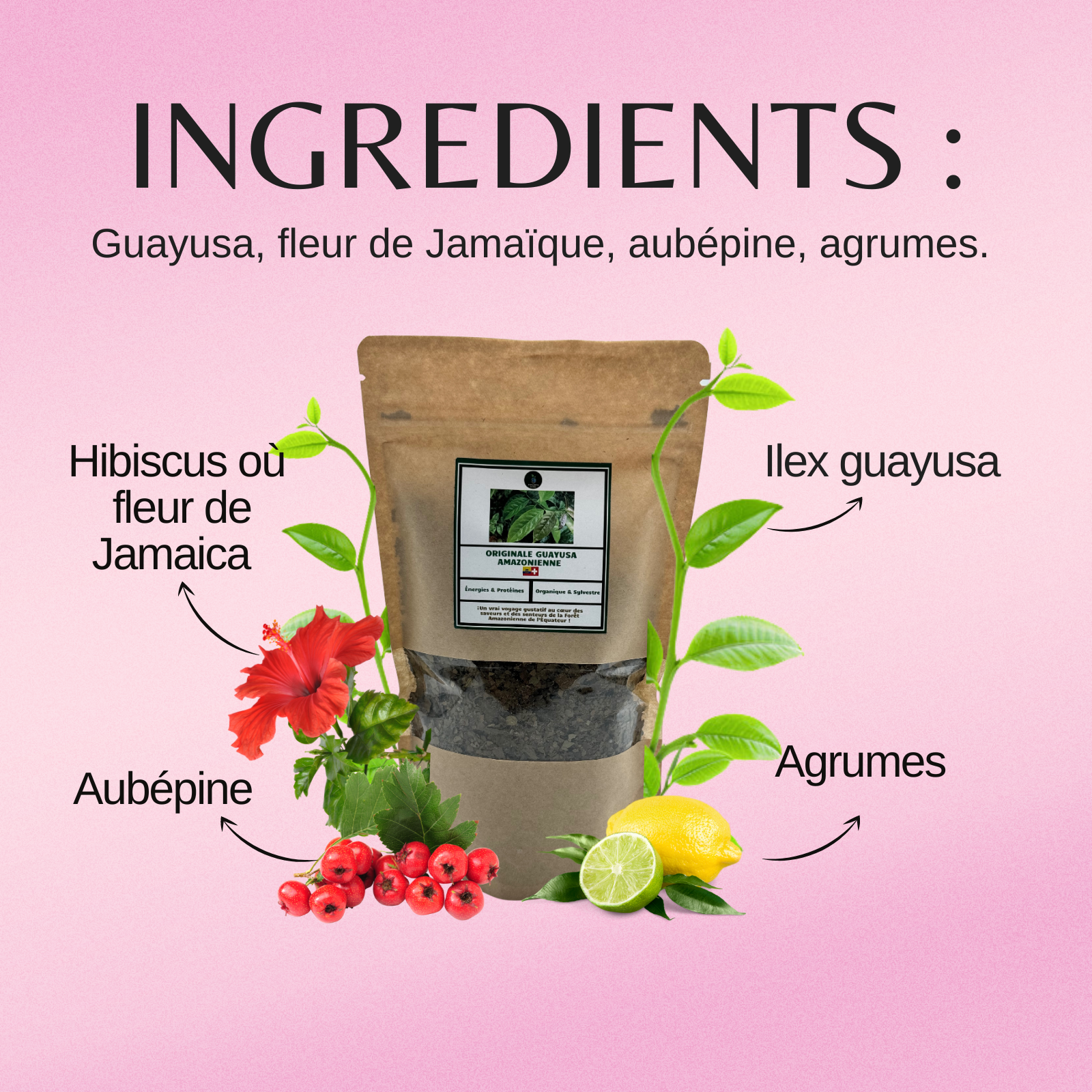 85 % d’Ilex Guayusa, hibiscus, fleur d’aubépine, citronnelle, agrumes de citron.