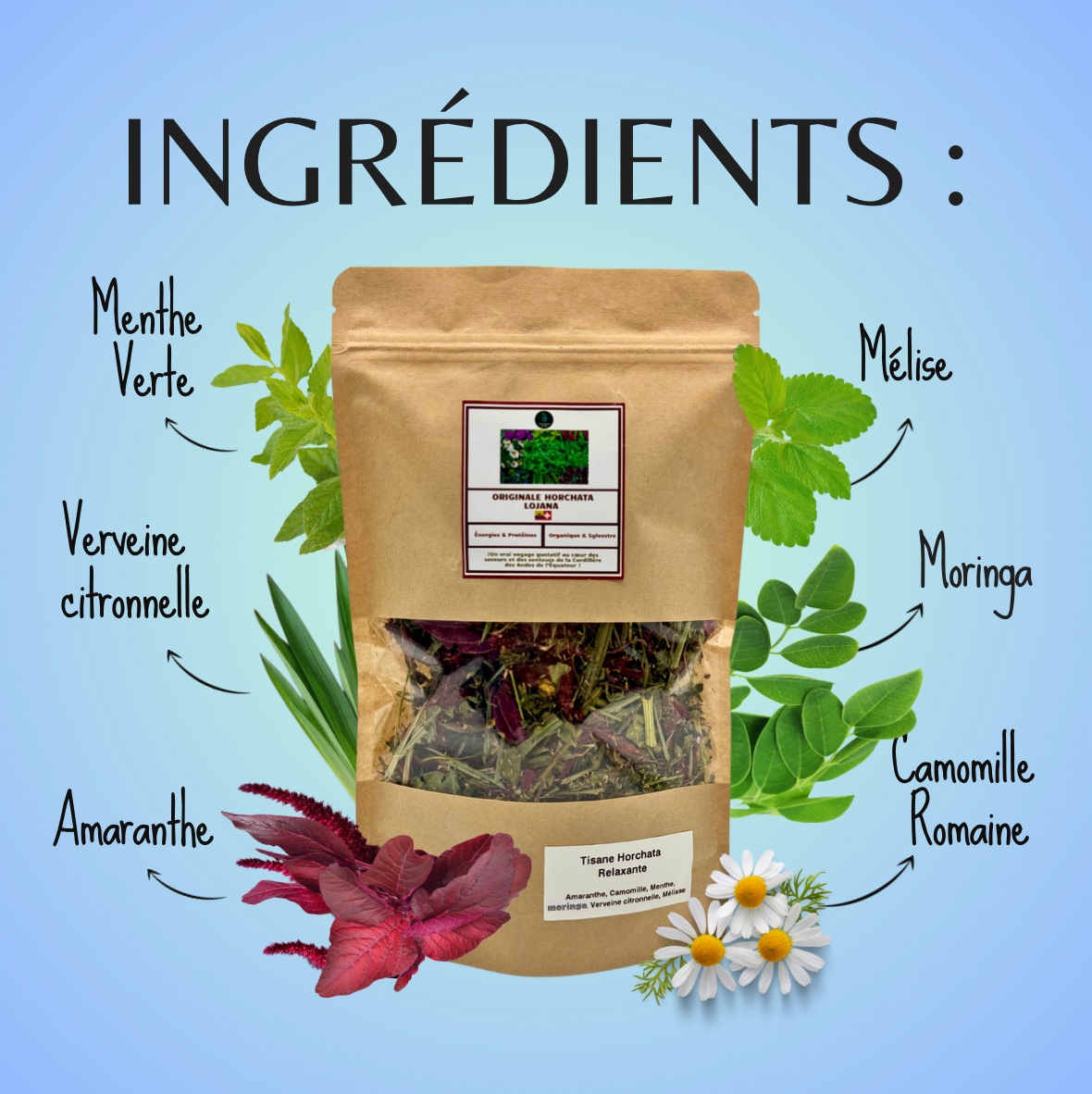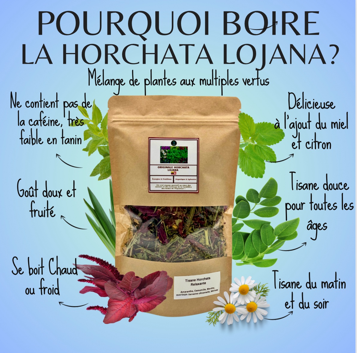 Horchata lojana est une boisson équatorienne traditionnelle, à base d’une variété d’herbes et de fleurs, notamment l’amarante, l’escancel ou la feuille de sang, la moringa, https://therapeutesmagazine.com/6-bienfaits-du-moringa-oleifera/, la verveine citronnée, la citronnelle, la menthe, la camomille, la mélisse, le géranium rose, entre autres.