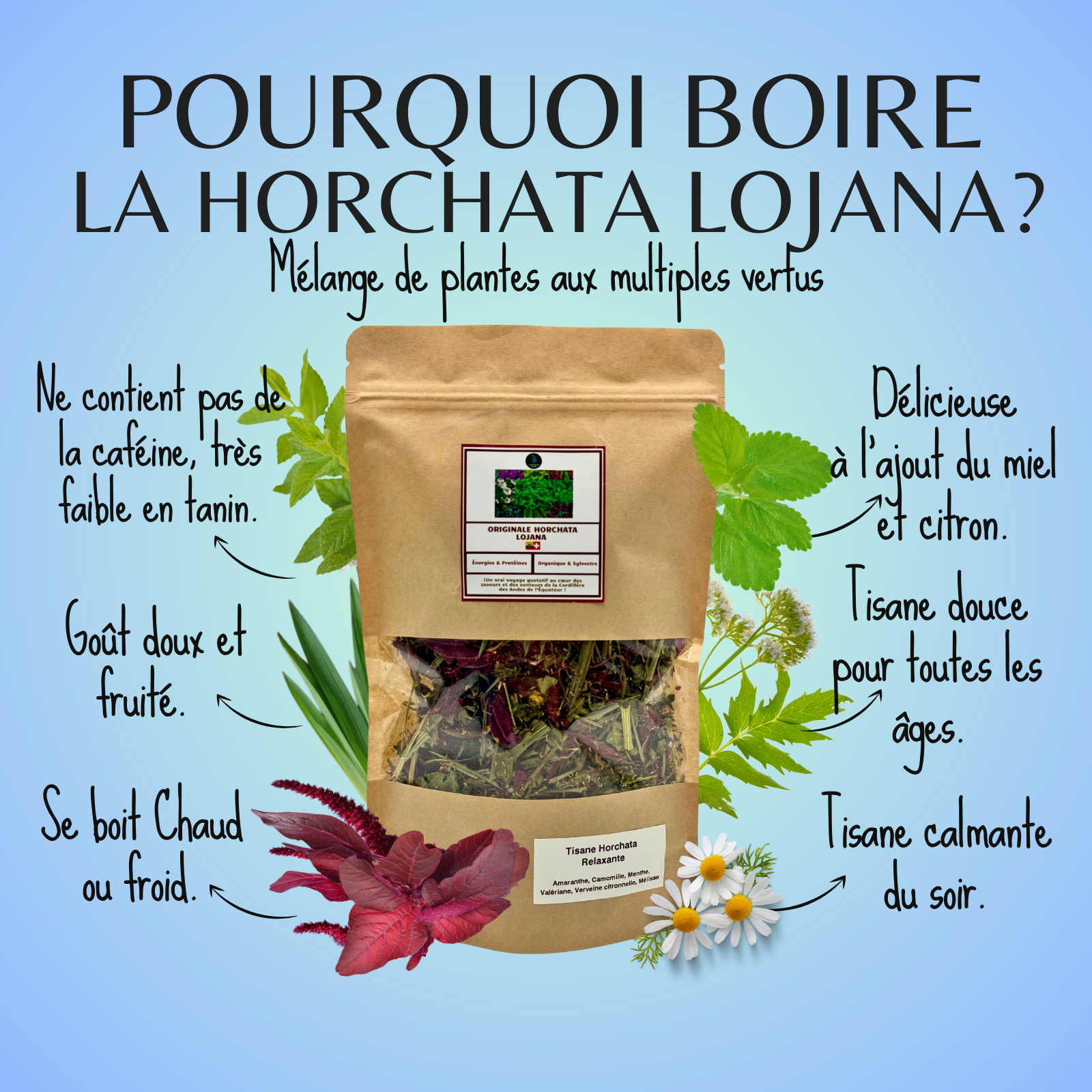Horchata lojana est une boisson équatorienne traditionnelle, à base d’une variété d’herbes et de fleurs, notamment l’amarante, l’escancel ou la feuille de sang, valériane, la verveine citronnée, la citronnelle, la menthe, la camomille, la mélisse, le géranium rose, entre autres.
