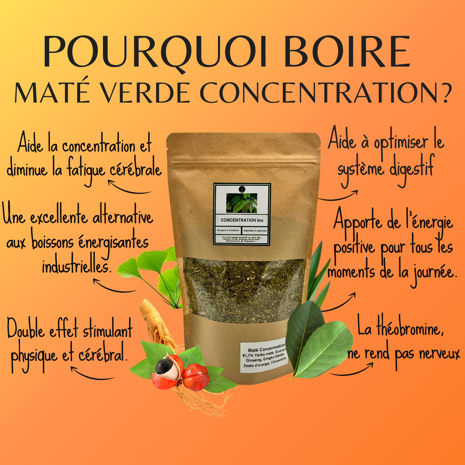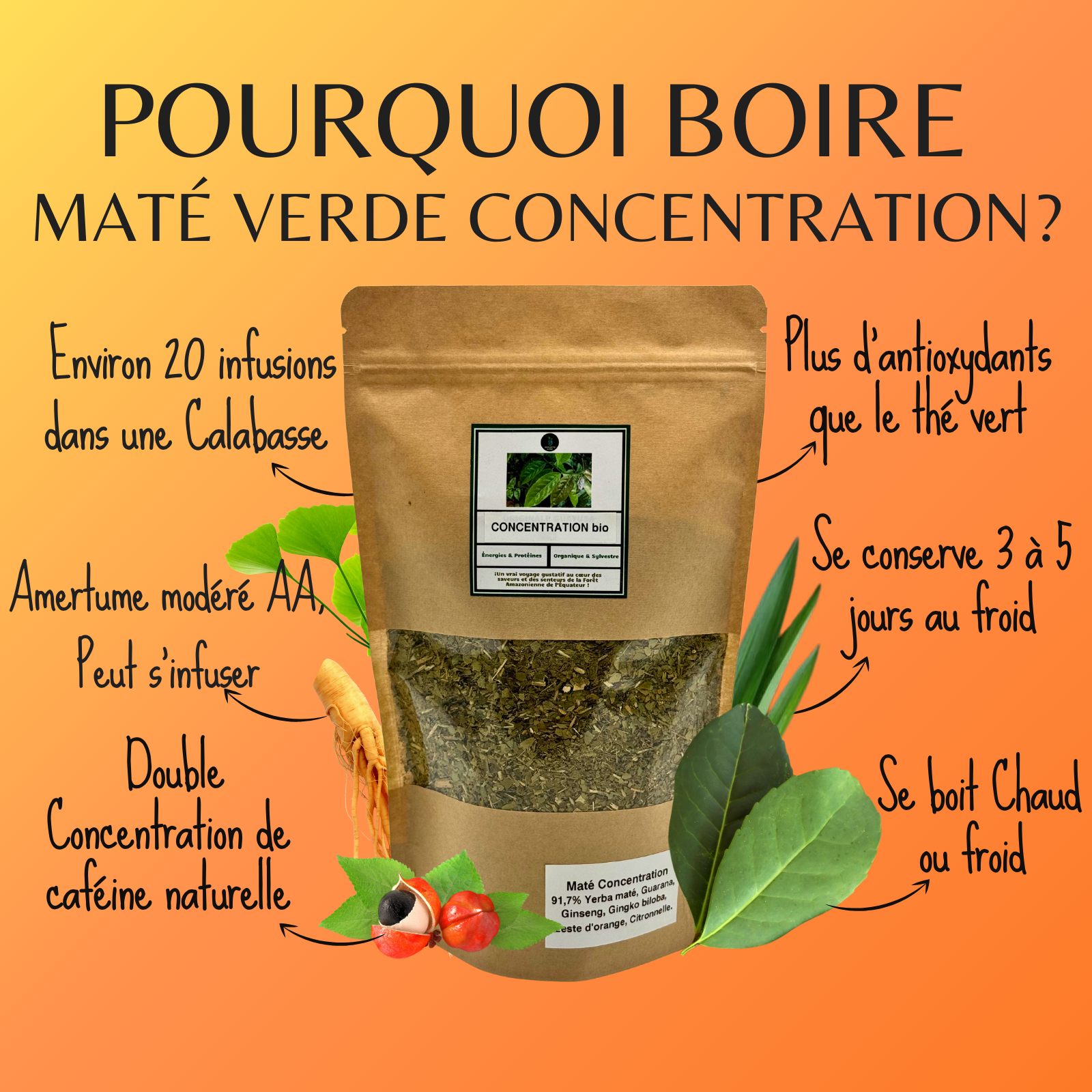 Mate Verde concentration, avec un taux élevé de caféine naturelle, c’est un excellent énergisant pour les personnes sensibles à la caféine. Elle apporte de l’énergie tout en douceur pour étudier, travailler et faire du sport toute au long de la journée, de plus, les feuilles de Maté Verde contiennent plus d’antioxydants que le thé vert !