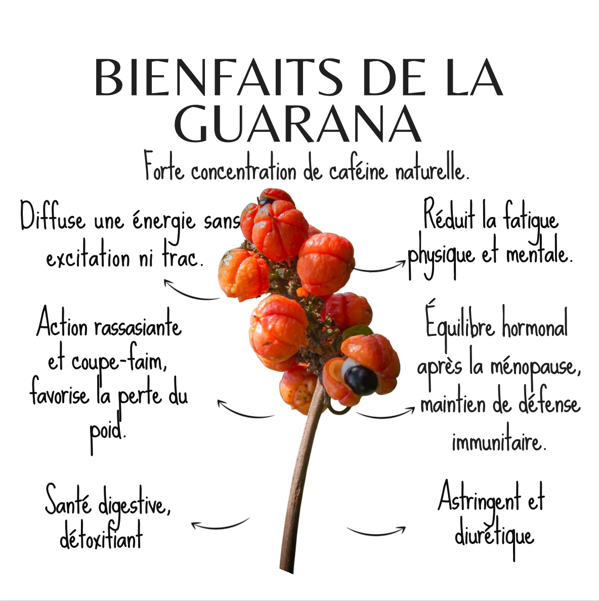 Favorise la perte de poids liée à l’alimentation: le guarana est traditionnellement utilisé dans les régimes amincissants pour trois raisons. Ses effets brûle-graisses combinés à la présence de guaranine, son effet équilibrant sur la glycémie, qui évite les fringales entre les repas et donc les grignotages inappropriés, son action rassasiante, c’est-à-dire son action rassasiante et coupe-faim.